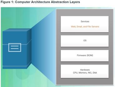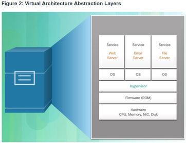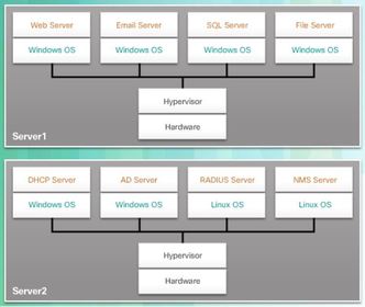 | Server Virtualization The use of virtualization normally includes redundancy to protect from a single point of failure. Redundancy can be implemented in different ways. ** If the hypervisor fails, the VM can be restarted on another hypervisor. Also, the same VM can be run on two hypervisors concurrently, copying the RAM and CPU instructions between them. If one hypervisor fails, the VM continues running on the other hypervisor. The services running on the VMs are also virtual and can be dynamically installed or uninstalled, as needed. | The hypervisor is a program, firmware, or hardware that adds an abstraction layer on top of the real physical hardware. The abstraction layer is used to create virtual machines which have access to all the hardware of the physical machine such as CPUs, memory, disk controllers, and NICs Each of these virtual machines runs a complete and separate operating system. With virtualization, enterprises can now consolidate the number of servers. For example, it is not uncommon for 100 physical servers to be consolidated as virtual machines on top of 10 physical servers using hypervisors. |