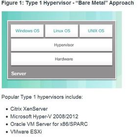 | Type 1 Hypervisors Type 1 hypervisors are also called the “bare metal” approach because the hypervisor is installed directly on the hardware. ** Type 1 hypervisors have direct access to the hardware resources; therefore, they are more efficient than hosted architectures. Type 1 hypervisors improve scalability, performance, and robustness. | |