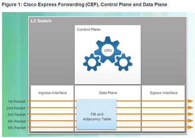 | Control Plane and Data Plane ** CEF is an advanced, Layer 3 IP switching technology that enables forwarding of packets to occur at the data plane without consulting the control plane. In CEF, the control plane’s routing table pre-populates the CEF Forwarding Information Base (FIB) table in the data plane. ** The control plane’s ARP table pre-populates the Adjacency table. Packets are then forwarded directly by the data plane based on the information contained in the FIB and Adjacency table, without the need to consult the information in the control plane. | |