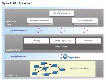| SDN Architecture Ej: Note the use of Application Programming Interfaces (APIs) within the SDN framework. An API is a set of standardized requests that define the proper way for an application to request services from another application. The SDN controller uses northbound APIs to communicate with the upstream applications. ** These APIs help network administrators shape traffic and deploy services. The SDN controller also uses southbound APIs to define the behavior of the downstream virtual switches and routers. OpenFlow is the original and widely implemented southbound API. Note: Traffic in a modern data center is described as North-South (going between external data center users and the data center servers) and East-West (going between data center servers). | |