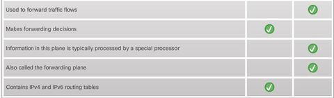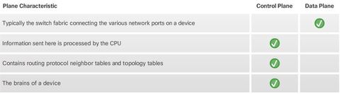 | Control Plane and Data Plane 1. Control plane - This is typically regarded as the brains of a device. It is used to make forwarding decisions. The control plane contains ** Layer 2 and Layer 3 route forwarding mechanisms, such as routing protocol neighbor tables and topology tables, IPv4 and IPv6 routing tables, STP, and the ARP table. Information sent to the control plane is processed by the CPU. | 2. Data plane - Also called the forwarding plane, this plane is typically the switch fabric connecting the various network ports on a device. The data plane of each device is used to forward traffic flows. ** Routers and switches use information from the control plane to forward incoming traffic out the appropriate egress interface. Information in the data plane is typically processed by a special data plane processor, such as a digital signal processor (DSP), without the CPU getting involved. |