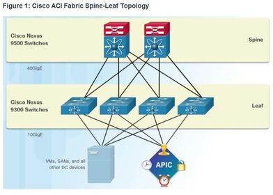 | Spine-Leaf Topology ** When compared to SDN, the APIC controller does not manipulate the data path directly. Instead, the APIC centralizes the policy definition and programs the leaf switches to forward traffic based on the defined policies. For virtualization, ACI supports multivendor hypervisor environments that would connect to the leaf switches, including the following: Microsoft (Hyper-V/SCVMM/Azure Pack) Red Hat Enterprise Linux OS (KVM OVS/OpenStack) VMware (ESX/vCenter/vShield) | |