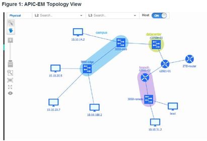 | APIC-EM Features 5. Host Inventory - Collects detailed information from hosts with the network including host name, user ID, MAC address, IPv4/IPv6 addresses, and network attachment point. 6. Topology - Supports a graphical view of the network (topology view). The Cisco APIC-EM automatically discovers and maps devices to a physical topology with detailed device level data. Ej: In addition, auto-visualization of Layer 2 and 3 topologies on top of the physical topology provides a granular view for design planning and simplified troubleshooting. | |