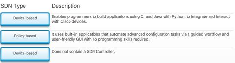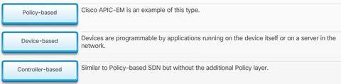 | SDN Types 3. Policy-based SDN - This type of SDN is similar to controller-based SDN where a centralized controller has a view of all devices in the network Policy-based SDN includes an additional Policy layer that operates at a higher level of abstraction. It uses built-in applications that automate advanced configuration tasks via a guided workflow and user-friendly GUI with no programming skills required. Cisco ** The Cisco Application Policy Infrastructure Controller - Enterprise Module (APIC-EM) extends ACI aimed at enterprise and campus deployments and is an example of this type of SDN. | |