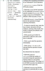 | Configure the IP SLA ICMP Echo Operation Ej: - The ip sla schedule command is scheduling the IP SLA operation-number 1 to start immediately (now) and continue until manually cancelled (forever). Note: Use the no ip sla schedule (operation-number) command to cancel the SLA operation. The SLA operation configuration is preserved and can be rescheduled when needed. | |