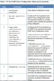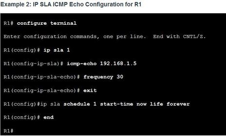| IP SLA Configuration Using IP SLAs for Troubleshooting Instead of using ping manually, a network engineer can use the IP SLA ICMP Echo operation to test the availability of network devices. A network device can be any device with IP capabilities (router, switch, PC, server, etc.). Ej: ? The IP SLA ICMP Echo operation provides the following measurements: | * Availability monitoring (packet loss statistics) * Performance monitoring (latency and response time) * Network operation (end-to-end connectivity) |