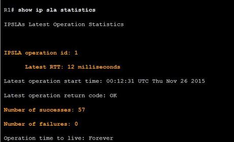 | Displaying IP SLAs Operation Statistics Ej: ? command to display the IP SLA operation monitoring statistics The example shows that the last ping to R3’s S1 interface has a 12 milliseconds round-trip time. Since the operation was started, it has tested connectivity 57 times with no failures. |