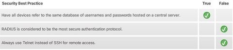 | AAA with RADIUS and TACACS+ However, the local database method does not scale well beyond a few networking devices because user accounts must be configured locally on each device. This is not suitable in a large enterprise environment with multiple routers and switches to manage. ** Additionally, the local database configuration provides no fallback authentication method. For example, what if the administrator forgets the username and password for that device? With no backup method available for authentication, password recovery becomes the only option. | A better and much more scalable solution is to have all devices refer to a database of usernames and passwords hosted on a central server. To support this, Cisco devices support the Authentication, Authorization, and Accounting (AAA) framework to help secure device access. Two AAA authentication protocols are supported on Cisco devices: - Terminal Access Controller Access-Control System Plus (TACACS+, pronounced as “tack-axe plus”) - Remote Authentication Dial-In User Service (RADIUS) |