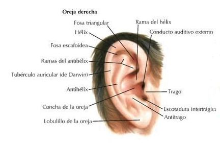 | 14 componentes de la configuración externa del pabellón auricular | Concha auricular Hélix Tuberculo auricular Vértice auricular Antihélix Fosa triangular Canal del hélix Trago Tubérculo supratrágico Escotadura anterior Antitrago Escotadura intertrágica Surco auricular posterior Lóbulo de la oreja |