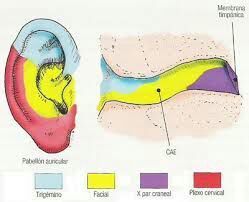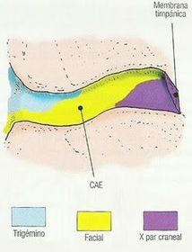 | Inervación sensitiva del CAE -Porción lateral -Pared posterior lateral -Pared posterior medial -Pared posterior | -Nervio auriculotemporal -Ramo auricular mayor -Nervio vago -Nervio facial |