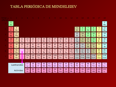 | Se dio cuenta de que clasificando los elementos según sus masas atómicas se veía aparecer una periodicidad en lo que concierne a ciertas propiedades de los elementos | La primera tabla contenía 63 elementos. La tabla de Mendeleïev condujo a la tabla periódica actualmente utilizada. |