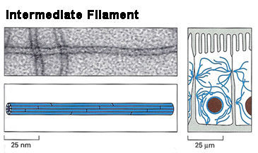 | Filamentos intermedios | -Grosor: 10-12 nm ( grosor intermedio)- -Localización: Células animales, citoplasma, lamina nuclear( rodea el núcleo). - Proteina estructural: Familia de 70 proteínas ( depende el tejido). Proteina motora: No tiene funciones de transportar. Función: Soporte y sostén. Ayuda a la célula a resistir la tensión. |