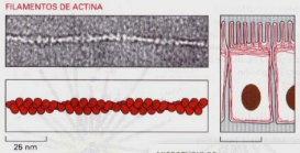 | Microfilamentos o filamentos de actina | -Grosor: 7-8 nm (Son los más pequeños). -Localización: Bordean la membrana. - Proteina estructural: Actina. - Proteina motora: Miosina ( son 18 tipos) ( La miosina ll es la encargada de la contracción muscular) ( Se clasifican en convencionales y no convencionales) . Función: Contráctiles ( muscular) esqueléticos. Soporte y organización celular. Desplazamiento celular. División celular ( se forma el anillo contráctil de la citocinesis). Para la contracción muscular la miosina y la actina interactúan y asi origina el movimiento |