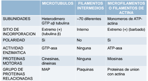 | Funciones de citoesqueleto | - Da soporte estructural a la célula. -Mantienen la posición de los organelos dentro de la célula. -Dirigen el movimiento de organelos y materiales en la célula. - Locomoción celular: Dirige la dirección de la célula. -División celular - Transducción y traducción de señales. |