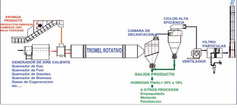 | Descripción de un secador rotatorio | En ellos el sólido desciende a lo largo de un cilindro rotatorio inclinado, secándose por acción del aire caliente que circula a contracorriente. |