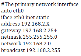Como se configura una red en linux 1. Se va y se edita como root el archivo /etc/network/interfaces quedando como en la imagen. 2. se reinicia el servicio /etc/init.d/networking restart 3. se comprueba la configuracion con ifconfig