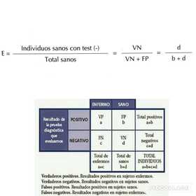 | Especificidad | Probabilidad de que un individuo sano tenga test negativo. Porción de individuos sanos confirmados con resultado negativo del test. |