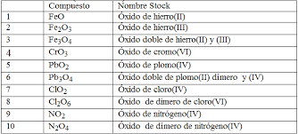 | nomenclatura stock | Stock consiste en nombrar a los compuestos escribiendo al final del nombre con números romanos la valencia atómica del elemento. indicando el número de electrones que un átomo pone para que se pueda ceder en un enlace químico. |