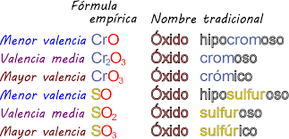 | nomenclatura tradicional | la nomenclatura tradicional consiste en indicar la valencia del elemento de nombre específicos con una serie de sufijos y prefijos |