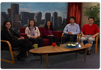 | What do you think the people in the picture are doing? | They're on a TV SHOW. |