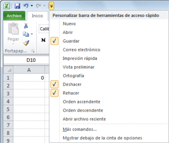 | Barra del título | Contiene el nombre del documento sobre el que se está trabajando en ese momento. Cuando creamos un libro nuevo se le asigna el nombre provisional Libro1, hasta que lo guardemos y le demos el nombre que queramos. En el extremo de la derecha están los botones para minimizar , maximizar y cerrar La barra de acceso rápido contiene las operaciones más habituales de Excel como Guardar , Deshacer o Rehacer . Esta barra puede personalizarse para añadir todos los botones que quieras. Para ello haz clic en una opción y aparecerá marcada. De igual forma, si vuelves a hacer clic sobre ella se eliminará de la barra. Si no encuentras la opción en la lista que te propone, puedes seleccionar Más comandos.... |