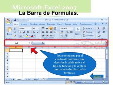 | Barra de formulas | Nos muestra el contenido de la celda activa, es decir, la casilla donde estamos situados. Cuando vayamos a modificar el contenido de la celda, dicha barra variará ligeramente, pero esto lo estudiaremos más adelante. |