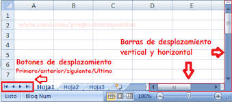 | Barras de desplazamiento | Permiten movernos a lo largo y ancho de la hoja de forma rápida y sencilla, simplemente hay que desplazar la barra arrastrándola con el ratón, o hacer clic en los triángulos. |