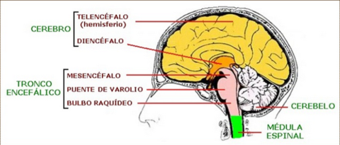 | ENCÉFALO: Está protegido por los huesos del cráneo. Presenta las siguientes partes: CEREBRO: Es el responsable de las funciones superiores como el intelecto y el lenguaje.CEREBELO: Participa en el control del equilibrio y postura del cuerpo. Se le llama: «Árbol de la vida». BULBO RAQUÍDEO: Participa en el control involuntario de funciones vitales. Es el centro del estornudo, tos y vómito. | |