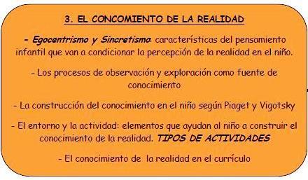| TEMA 5 “DESARROLLO COGNITIVO HASTA LOS 6 AÑOS. EL CONOCIMIENTO DE LA REALIDAD. LA OBSERVACIÓN Y EXPLORACIÓN DEL MUNDO FÍSICO, NATURAL, SOCIAL. GÉNESIS Y FORMACIÓN DE LOS PRINCIPALES CONCEPTOS.” | |