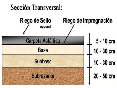 | Riegos de imprimación y de adherencia | Riego de imprimación: estabiliza e impermeabiliza las partículas granulares de la capa base. Riego de adherencia: se usa para pegar los materiales (el suelo con el asfalto) |