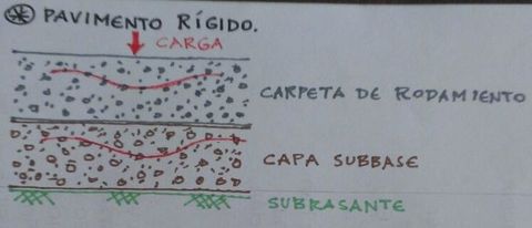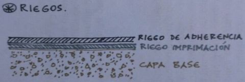 | PAVIMENTOS RÍGIDOS. - Carpeta de rodamiento (CR). De concreto de cemento Portland (PCC); puede ser: Normal o convencional, ó reforzado (acero). - Subbase. Estabilizada con cemento o asfalto. No estabilizada (agregados). -Subrasante. Compactada y natural. | RIEGO DE IMPRIMACIÓN - Su función principal es estabilizar la capa base. - Si en el proceso de la construcción de la carretera no hay presupuesto y pasara un tiempo para la colocación de la carpeta de rodamiento, es fundamental la colocación del riego de imprimación, se utiliza un solvente (gasolina) para diluir el cemento asfáltico o asfalto a utilizar. Impermeabiliza las capas. Se debe barrer la superficie antes de hacer la imprimación. |