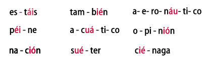 | Reglas de acentuación de los diptongos: | Las palabras con diptongo siguen las mismas normas de acentuación que el resto de las palabras |