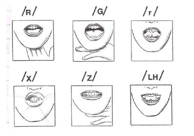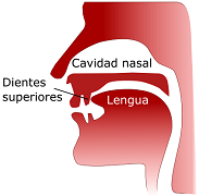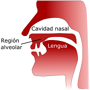 | -Dental: lengua detrás de los dientes superiores - /t/, /d/ (tarde). -Alveolar: lengua sobre raíz de dientes superiores - /s/, /l/, /r/, /rr/, /n/ (sala, rana). | |