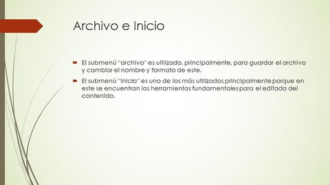 | En esta diapositiva se muestran los súbmenus inicio y archivo. | |