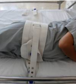 | Correas de sujeción-Sujeción abdominal Permite al paciente la mayor libertad de movimientos en la cama, con la mayor seguridad. Puede instalarse sin complicaciones, antes o después de que el paciente se haya acostado.La parte inferior se sujeta a la cama y la superior se coloca alrededor de la cintura del paciente. | |