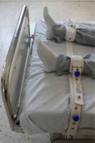 | Correas de sujeción - Pies La sujeción de los pies sirve para fijar de forma relajada ó firme, uno o ambos pies. De igual funcionamiento y características que la muñequera. Fijando relajadamente, es posible determinar una cierta libertad para los pies, pudiendo girar el cuerpo, en posición lateral o boca abajo. | |