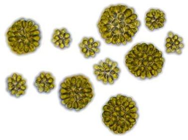 | DYATOMS | Son algas unicelulares; constituyen el fitoplancton, algunas de ellas pueden vivir en colonias formando filamentos o cintas, se hallan rodeadas por una pared celular. Hecha de sílice llamada frústula. Se sostiene que son las únicas algas verdaderas al no presentar estructuras propias del Reino Animal. |