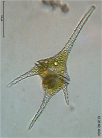 | DYNOPHYCEA | Son unicelulares y flageladas aunque hay formas sin flagelo. Presentan dentro de la membrana plasmática una coraza constituida por varias placas engarzadas. Presentan apéndice. Las placas son de celulosa. Tonalidad parda. Sustancias de reserva almidón. |