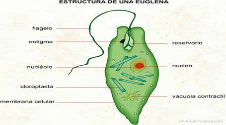 | EUGLENOPHYTA | Son algas generalmente unicelulares organizadas de forma monadal, salvo el género Colacium, que es cenobial. Son típicamente algas dulceacuícolas. Se multiplican asexualmente por bipartición longitudinal; se desconoce su tipo de reproducción sexual y también su ciclo biológico. Sus cloroplastos son verdes |