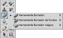 Herramienta borrador: Sirve para borrar partes de una imagen. Ojo, puesto que como muchas otras herramientas, sólo actúa sobre la capa que está seleccionada. Es decir, sólo borra las cosas que haya en la capa que estamos trabajando. |