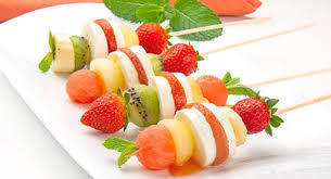 pinchos de frutas : fresas , mandarinas ,banano , kiwis , piña y papaya