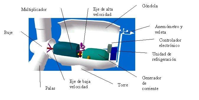 - Multiplicador: aumenta la velocidad del eje de alta velocidad - Eje de alta velocidad: permite el funcionamiento de generador eléctrico - Generador eléctrico - Torre: une la góndola y el rotor - Anemómetro: conecta el aerogenerador |