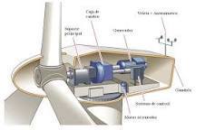 La góndola,las palas,el buje,eje de baja velocidad,el multiplicador,eje de velocidad,el generador eléctrico, el controlador eléctrico,la unidad de refrigeración,la torre,el mecanismo de orientación,el anemómetro y el panel. |