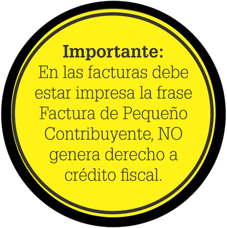 | OBLIGACIONES DEL PEQUEÑO CONTRIBUYENTE (1) | 1. Autorizar facturas, las cuales debe identificar como “Factura de Pequeño Contribuyente” y agregar la frase dentro de los márgenes de la factura: “NO GENERA DERECHO A CREDITO FISCAL”. |