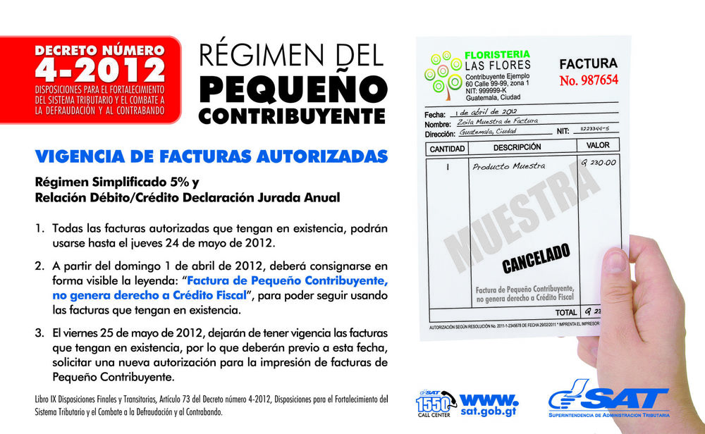 | OBLIGACIONES DEL PEQUEÑO CONTRIBUYENTE (2) | 2. Emitir siempre facturas de pequeño contribuyente en todas sus ventas o prestación de servicios mayores de Q50.00 (en el caso de ventas o prestación de servicios menores a este monto, deberá consolidar el monto de las mismas en una sola factura que debe emitir al final del día). |