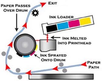 | Laser printer 1. how 2. sizes 3. pros and cons | 1. electric charge on rotating drum - laser discharges charge on drum - laser draws imagine to be printed on drum - drum coded with toner (black powder) - as drum is coded, toner only clings to where laser has drawn - paper goes through, toner placed on printer 2. personal = small, business = large 3. + high quality - most expensive |