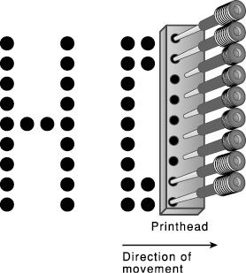 1. pins on the print head strike against a cloth ink ribbon that comes into direct contact with the paper - these pins produce each character in the form of dots 2. + cheap, last long, durable, multi-copy documents eg. carbon copies - poor quality, noisy, old |