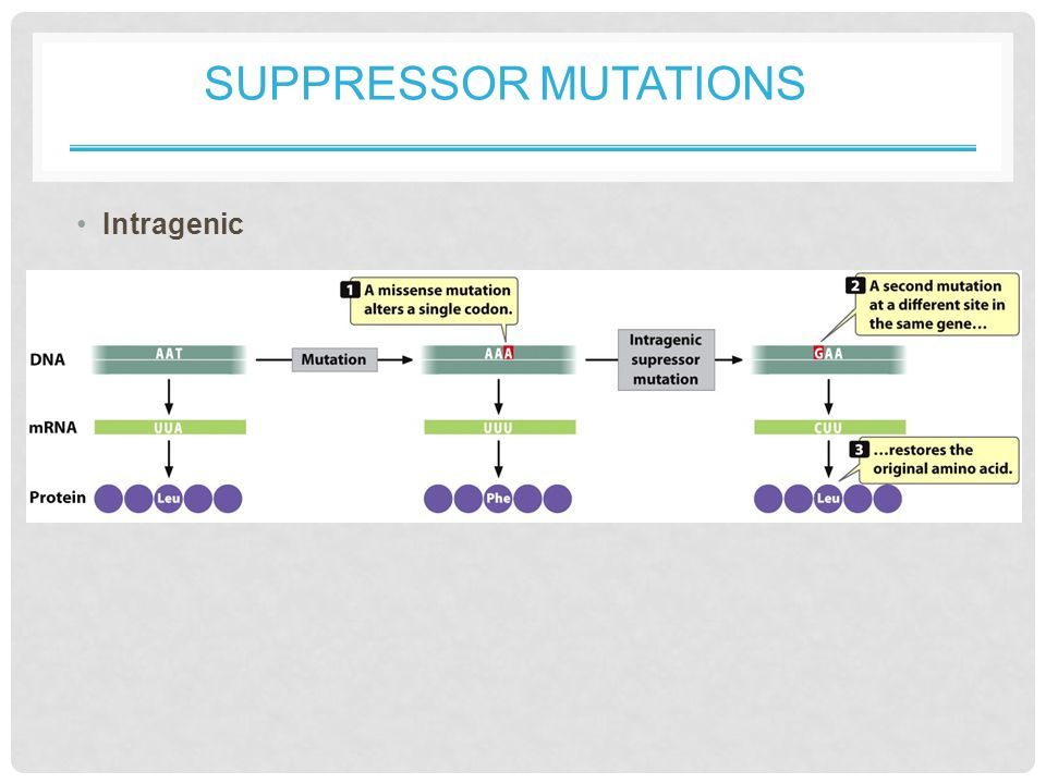 Examples: A second mutation on a gene coding for tRNA that causes a tRNA carrying lys to bind with the mutated stop codon instead of early termination |