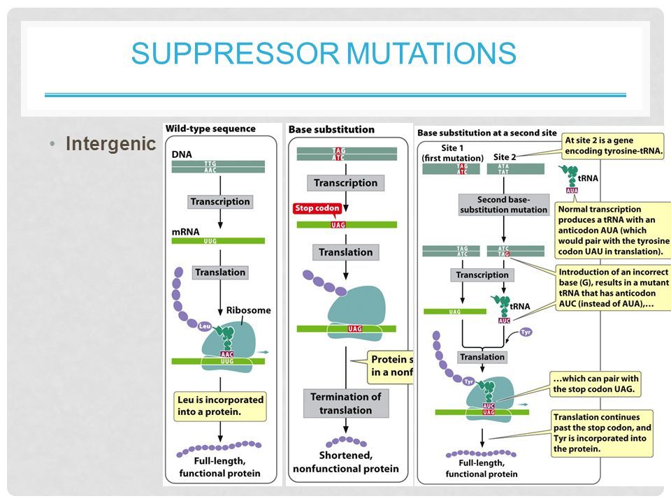 | Suppressor | Changes the _____ type phenotype into a _____ phenotype by altering the ________type at a different site from the original mutation |