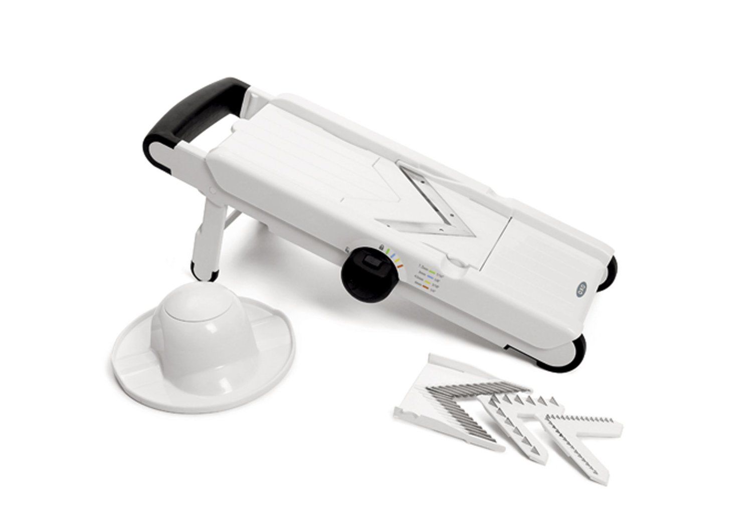 Manually operated slicer made of stainless steel with adjustable slicing blades to slice and julienne. |